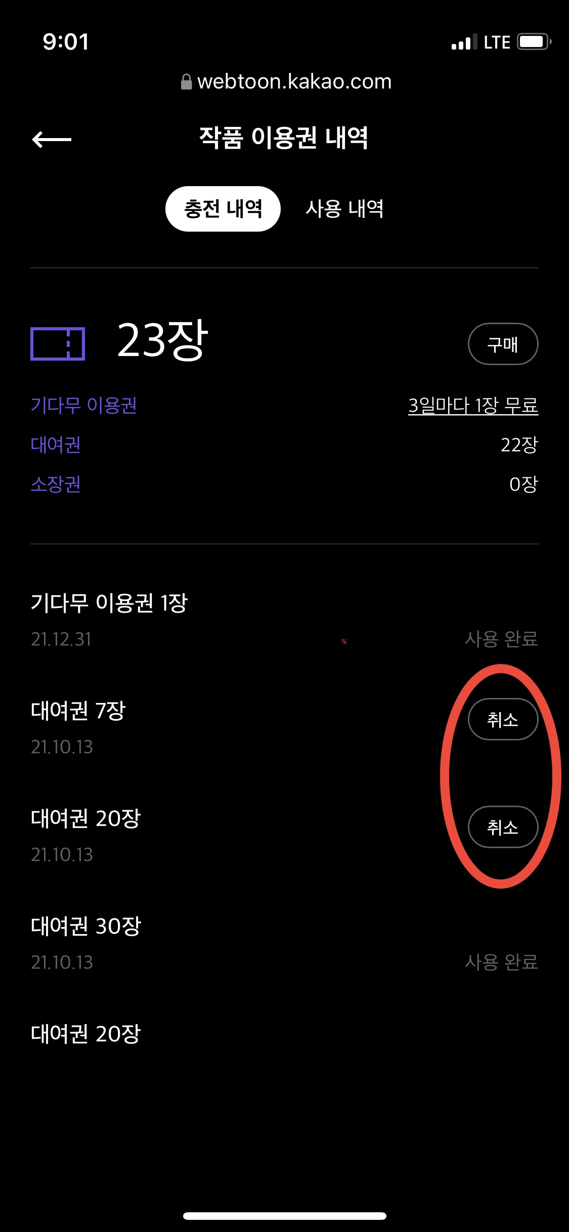 대여권 7장 20장에만 취소 아이콘이 있습니다.