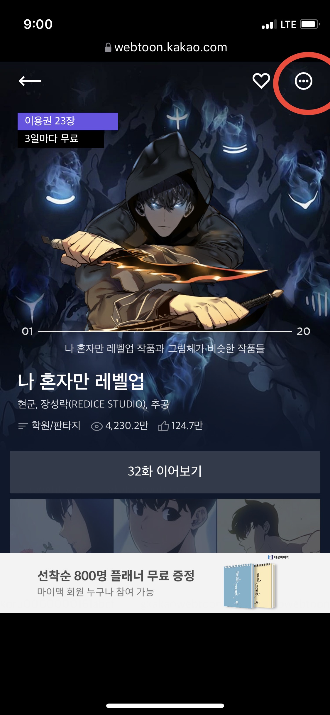 먼저 이용권이 남은 웹툰에서 오른쪽 상단 점 세개를
