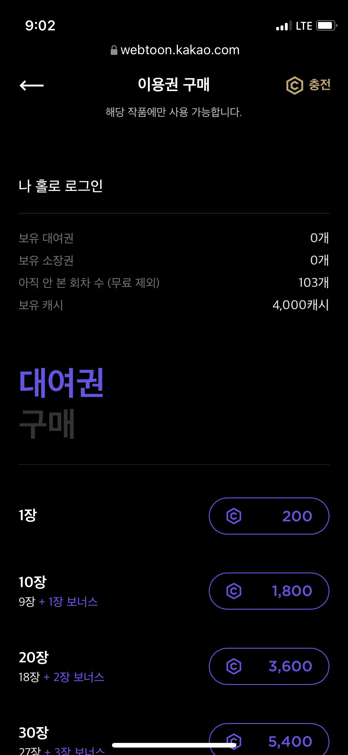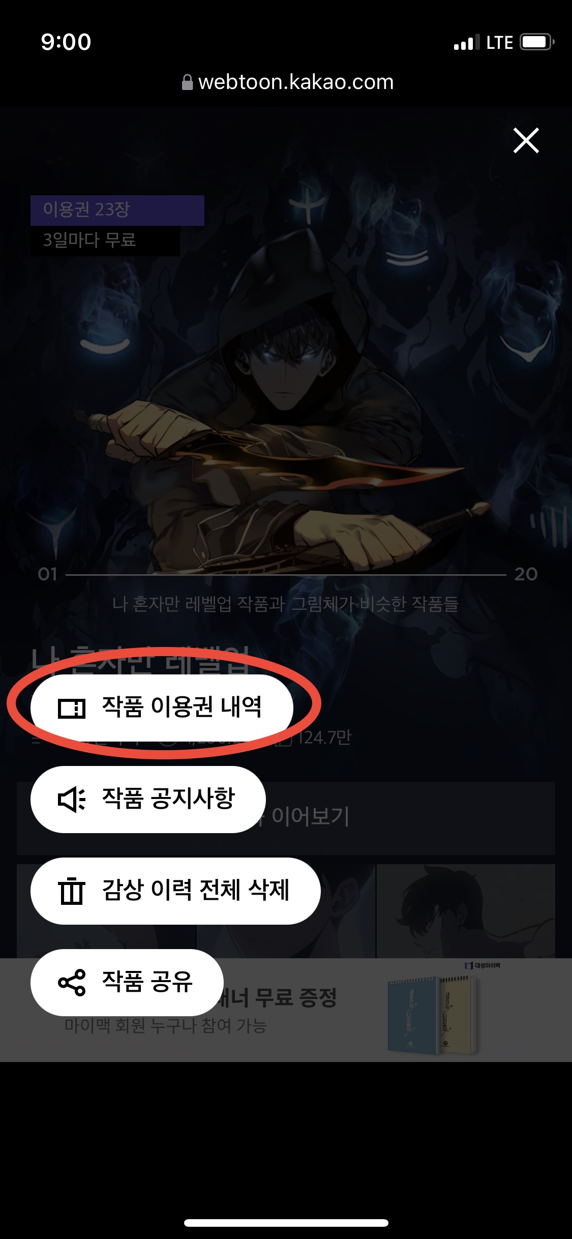 그럼 다음과 같은 작품 이용권 내용이 나오고요.