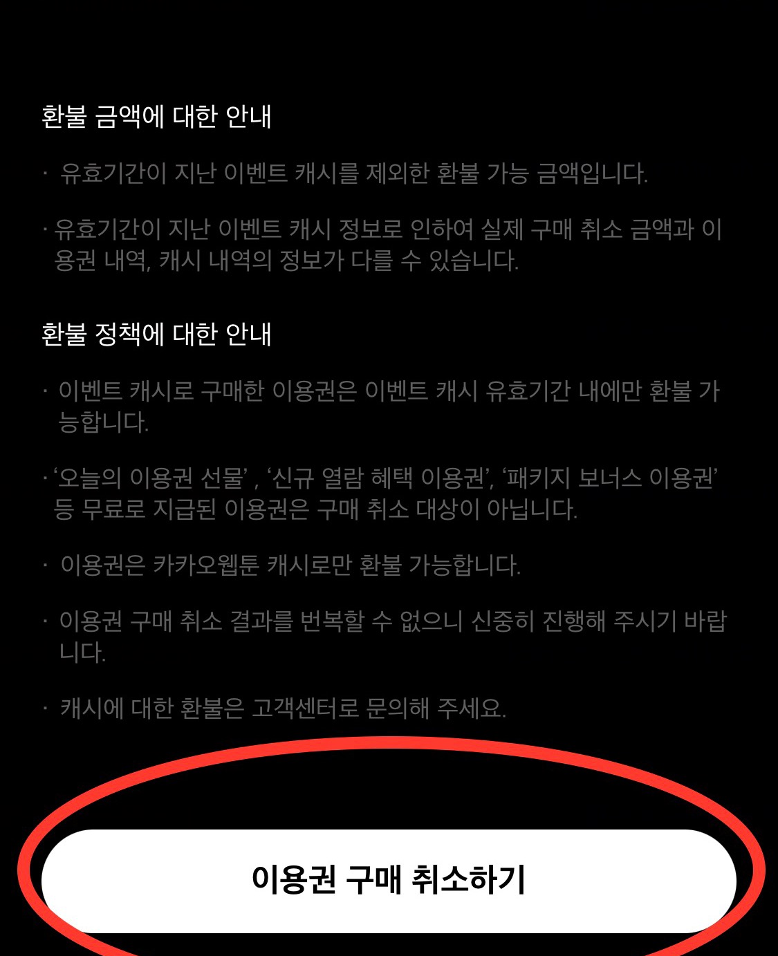 하단으로 향하면 이렇게 이용권 구매 취소하기가 뜨고요.