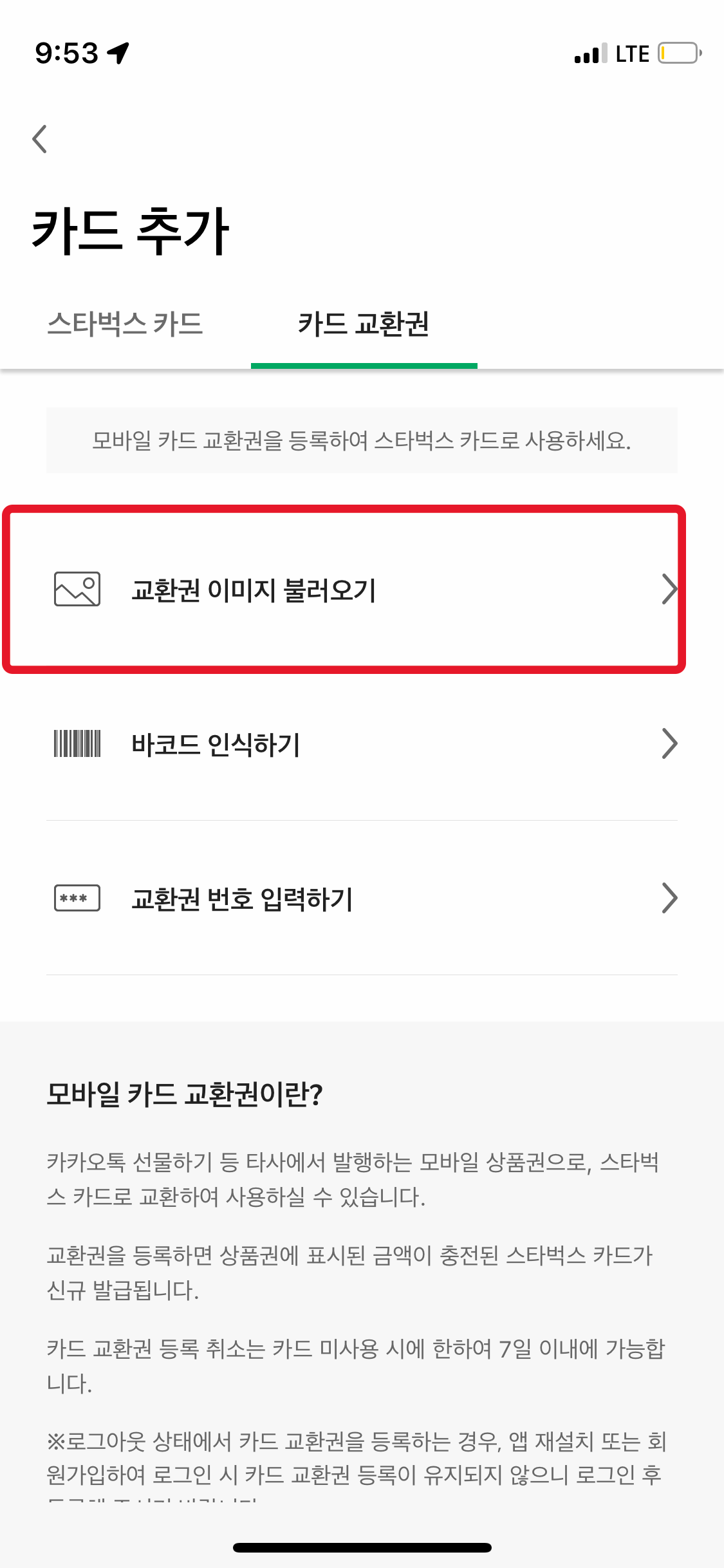 그중 첫번째인 교환권 이미지 불러오기를 누르고 갤러리에 있는 바코드가 있는 교환권 이미지를 선택하면 된다.