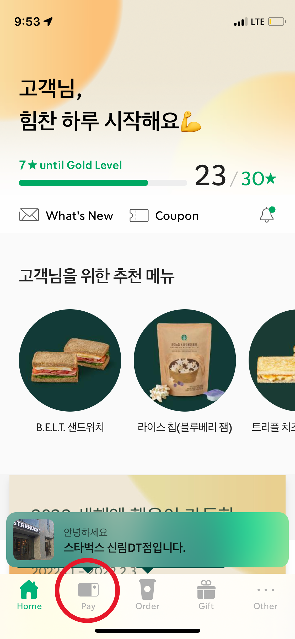 처음 앱을 열면 홈화면이 나오는데, 아래 메뉴의 Pay 또는 폰을 흔들면, (스타벅스의 쉐이크 투 페이 라는 기능으로, 스타벅스 앱 쓰는 사람은 따로 누르지말고 핸드폰을 흔들면 바로 결제할 수 있는 바코드가 나오니까 알아두면 좋다.)