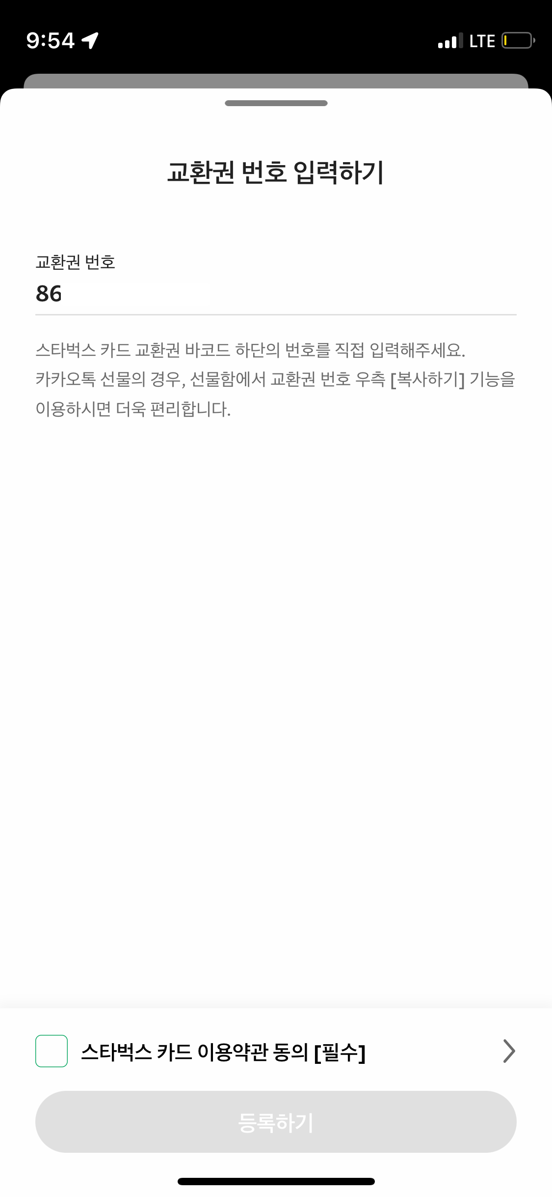 그러면 자동으로 교환권 번호가 입력되고, 아래 스타벅스 카드 이용약관 동의를 체크 하고 등록하면,