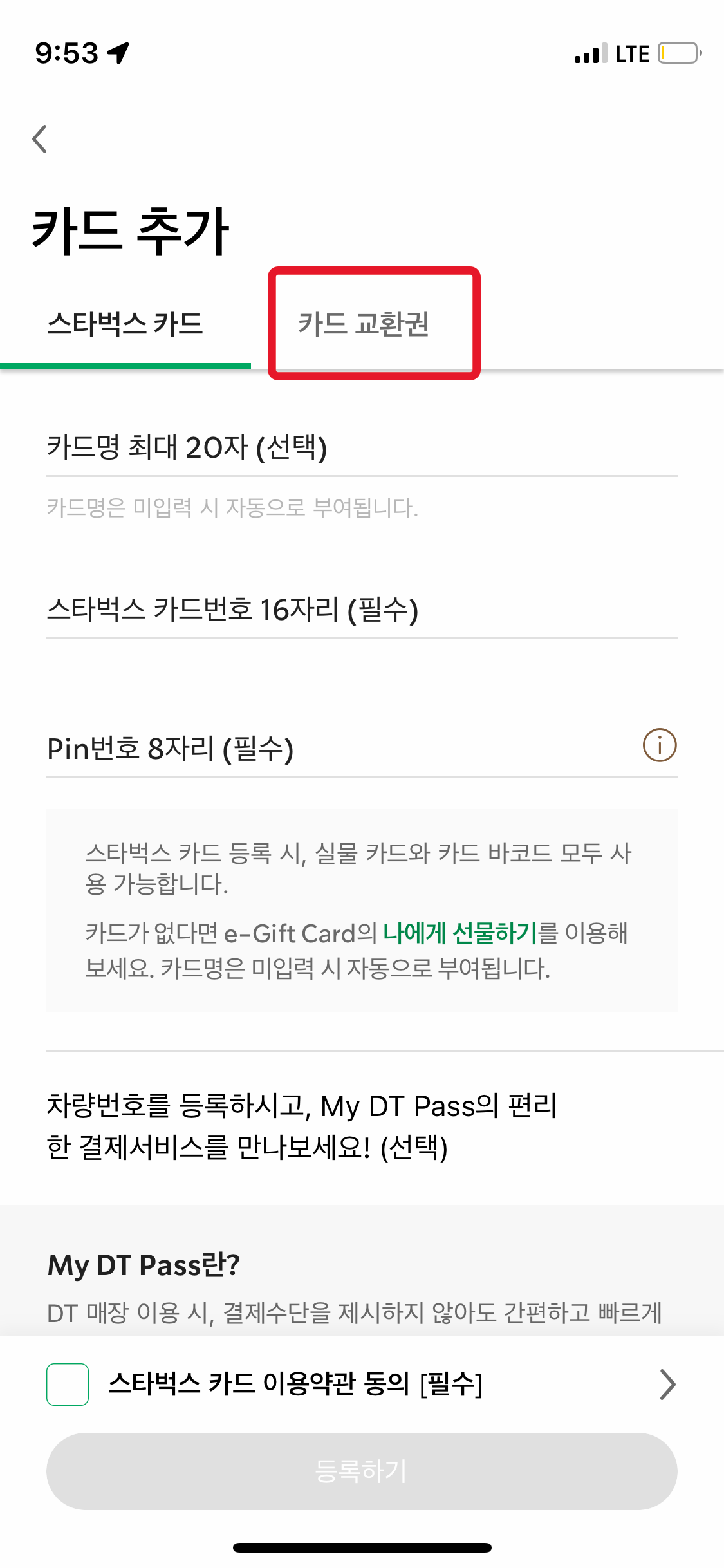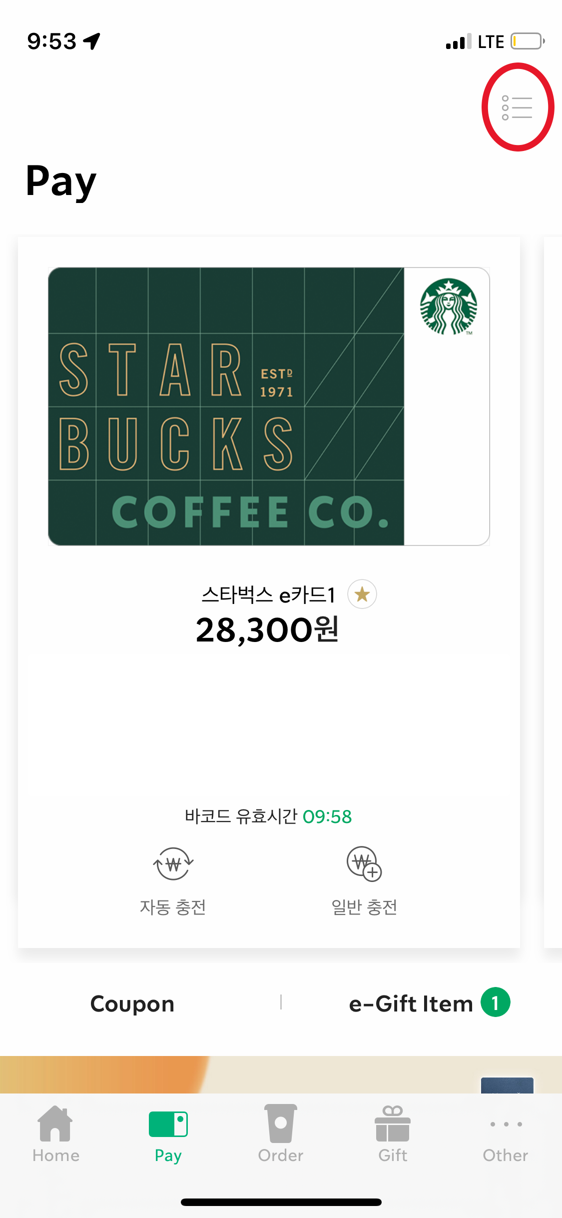 그중에 스타벅스 E 카드도 있었는데, 이걸 어떻게 앱에 넣는지 몰라서, 파트너분께 여쭤보니 친절하게 방법을 알려줬다.