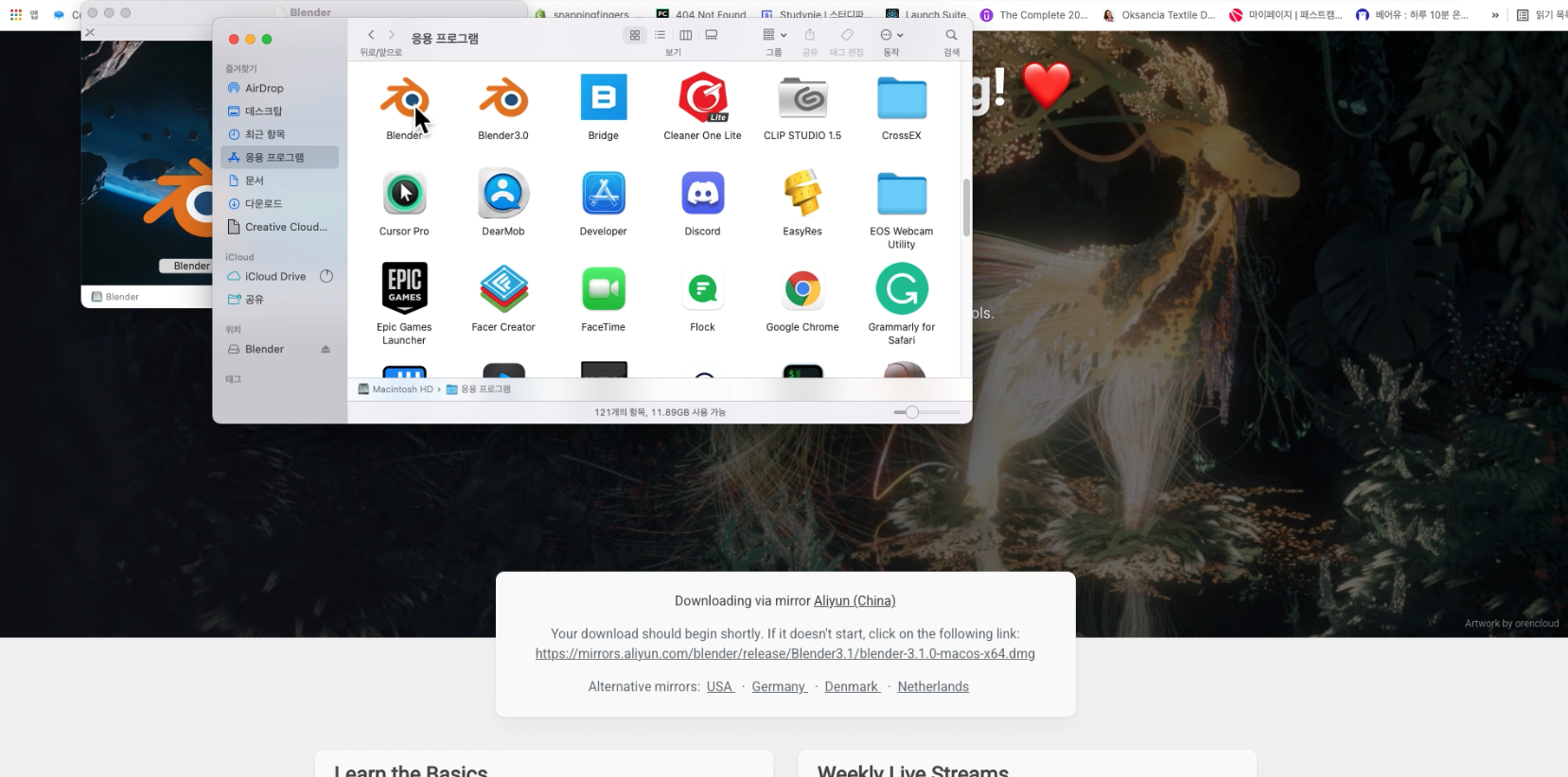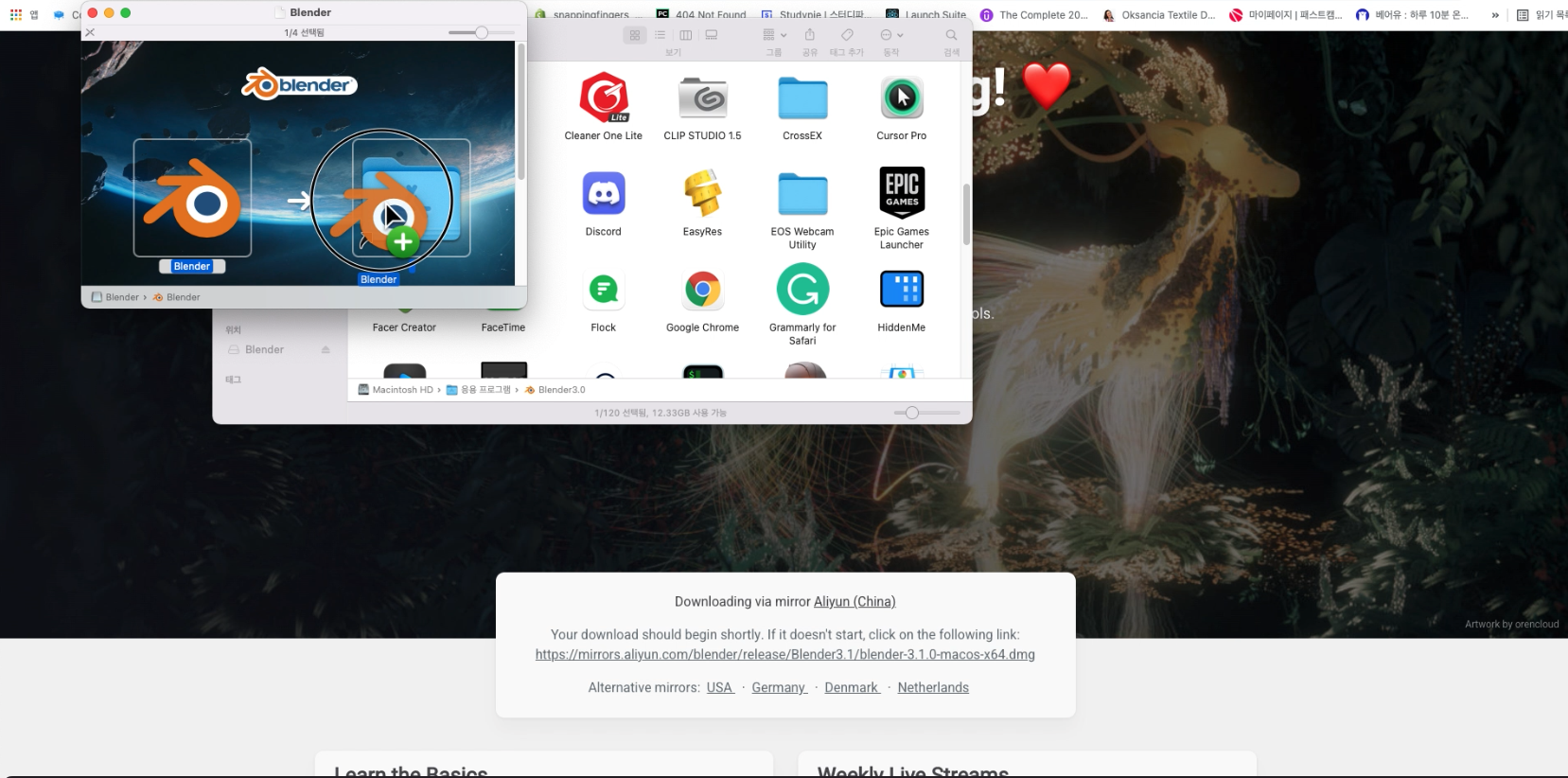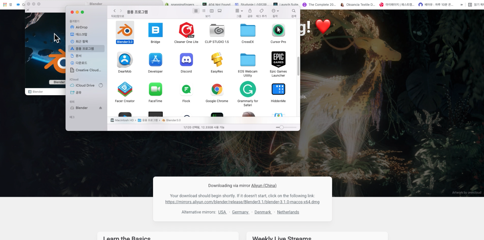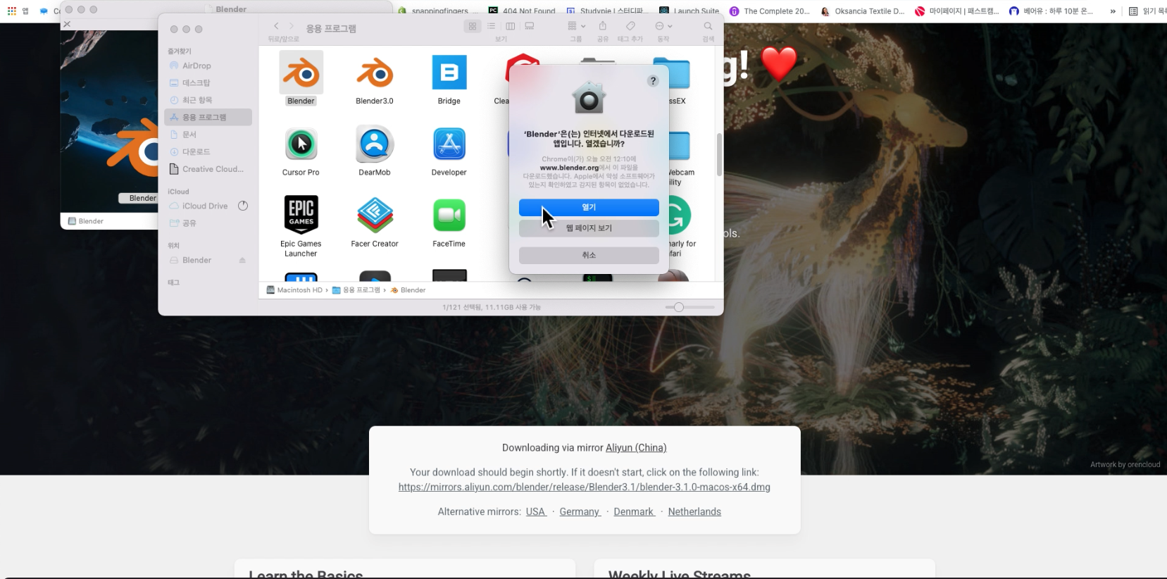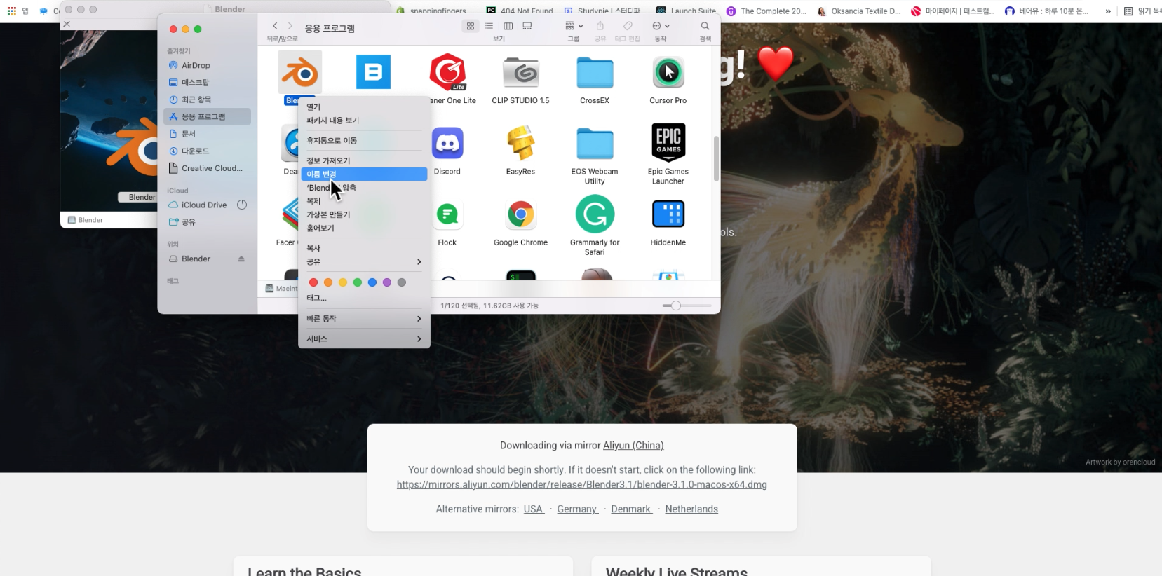이를 위해서는 파인더에서 응용프로그램 그리고 기존에 다운로드한 블렌더 아이콘의 이름 변경을 클릭하고.