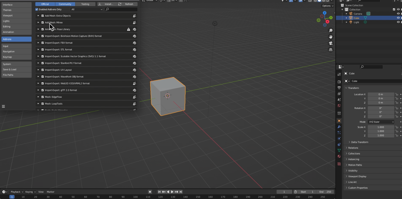 프리퍼런스에서 확인해보면 이전에 깔아 둔 모든 애드온이 깔려 있는 것을 볼 수 있다.