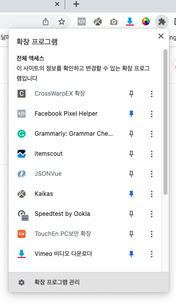 먼저 크롤 상단 오른쪽에 퍼즐모양의 확장프로그램 창을 활성화 시킨다.