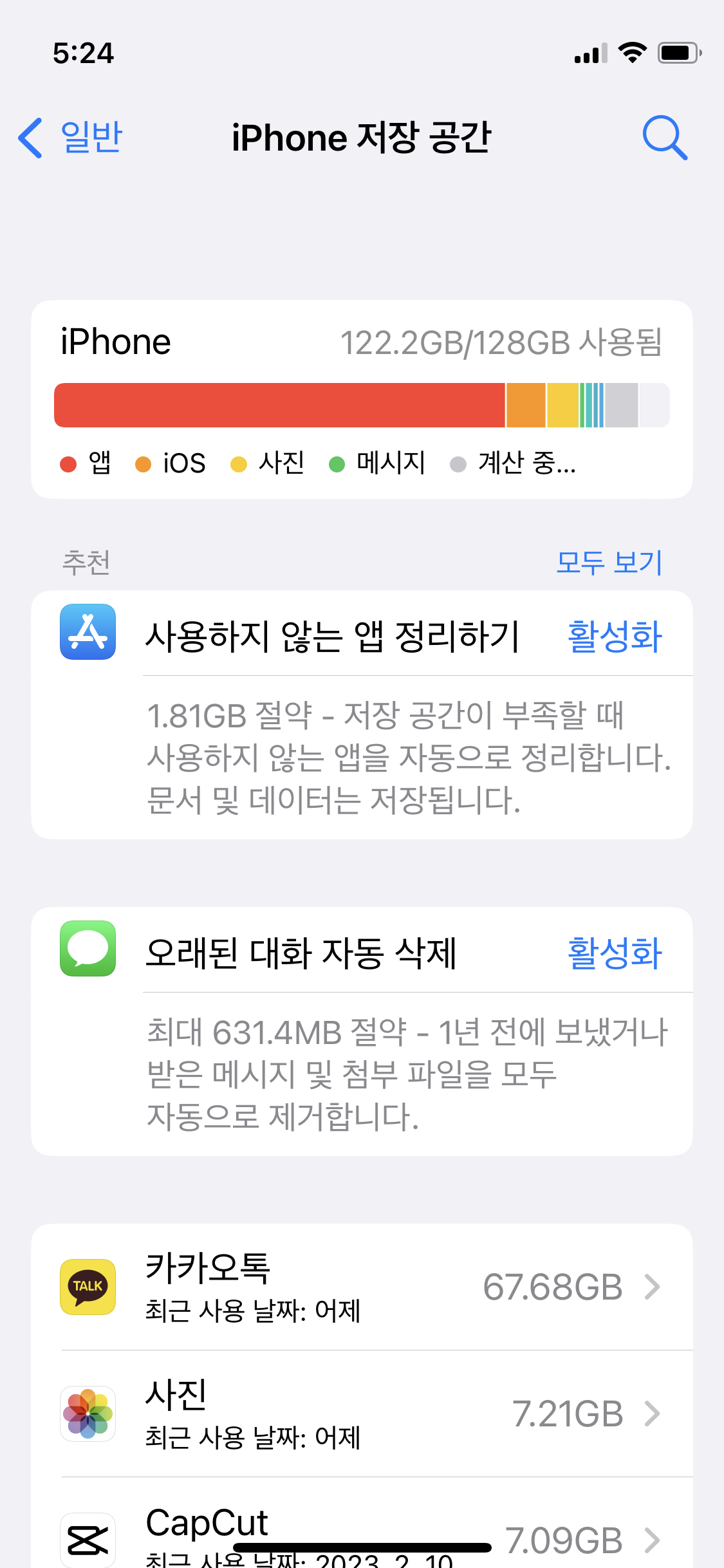 그걸 지우고 나니 진짜 이제는 용량 걱정 없이 앱을 잘 깔고 사용하고 있다. 맨날 용량 모자라서 캐시 지우고, 이젠 뭘 지워야 하나 했던 고민들이 싹 사라진 것이다.