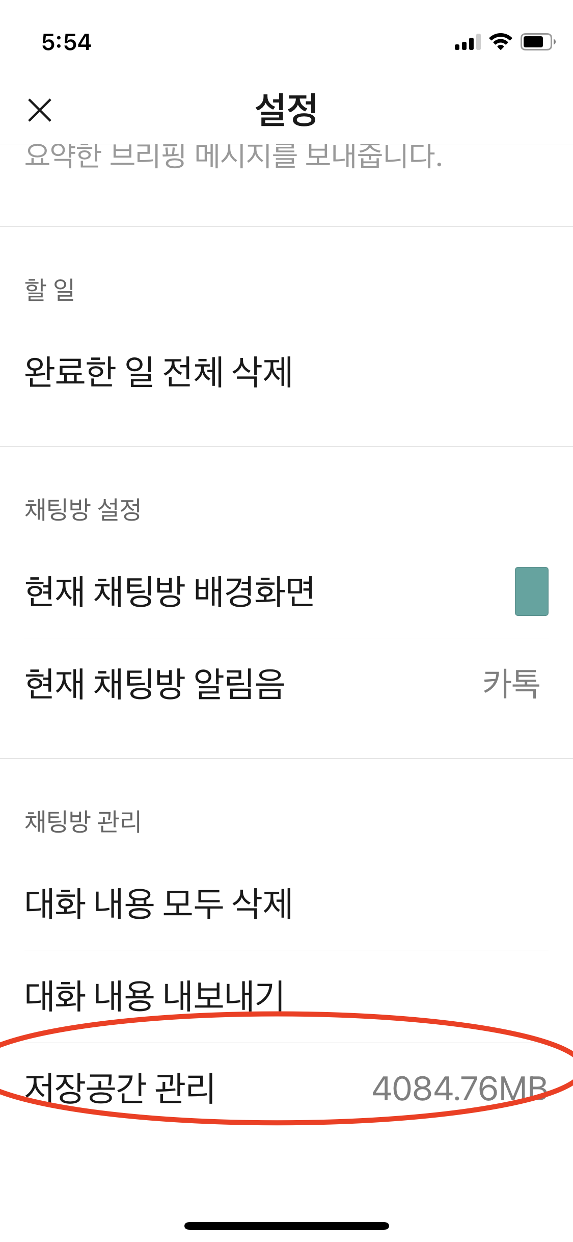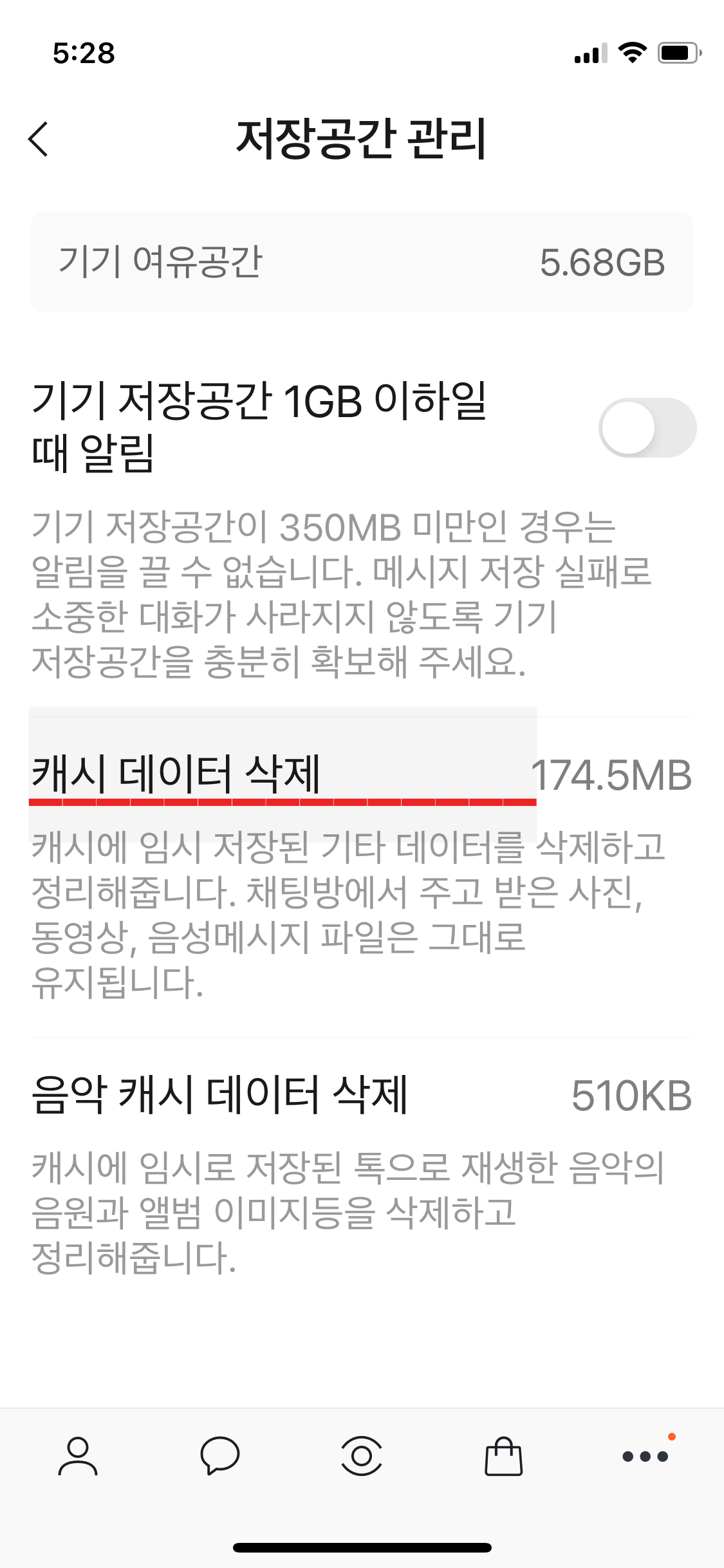 물론 채팅방을 나가면 되는 일이지만 그러면 전에 있던 대화, 링크 들은 다 날아가는 것이기 때문에 그렇게 못하는 것도 있어서, 항상 그냥 더보기에 저장공관 관리에 캐시데이터 삭제만 진행했다.