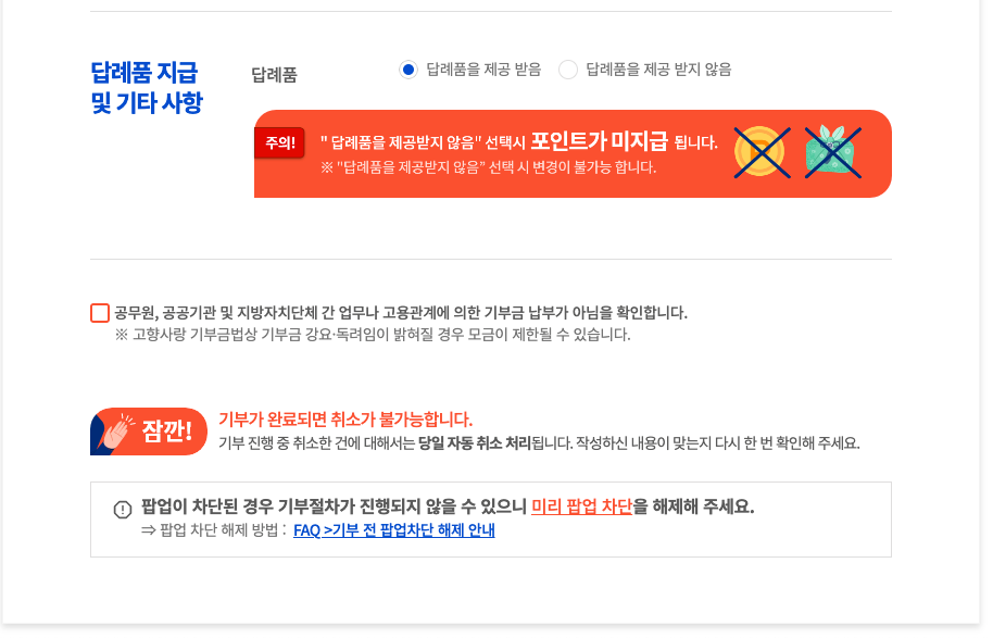 그 후 기부하실 금액과 답례품 지급 및 기타 사항 선택이 있는데, 여기서 답례품을 제공받지 않음을 선택하면 기부 포인트를 받을 수 없으니 답례품을 제공받음으로 꼭 체크하세요!