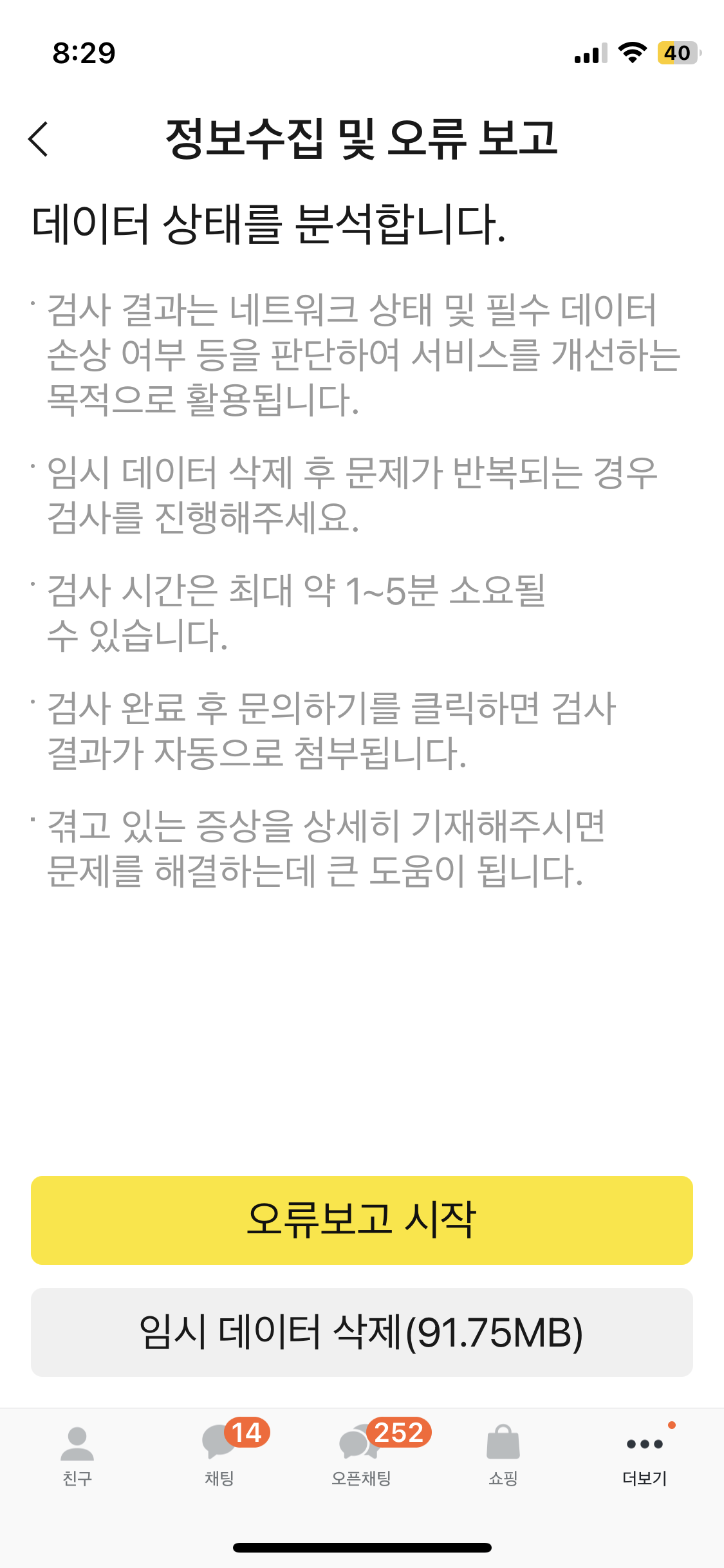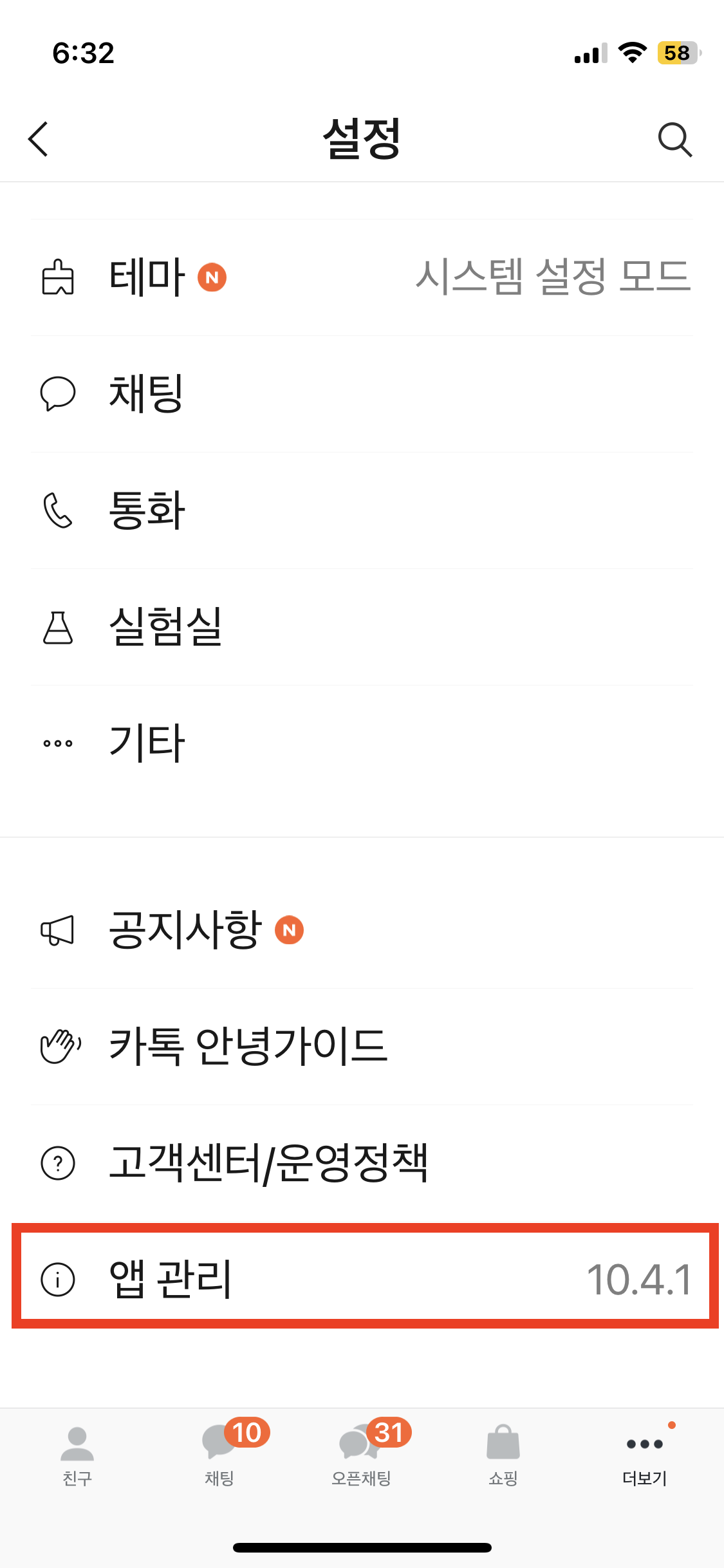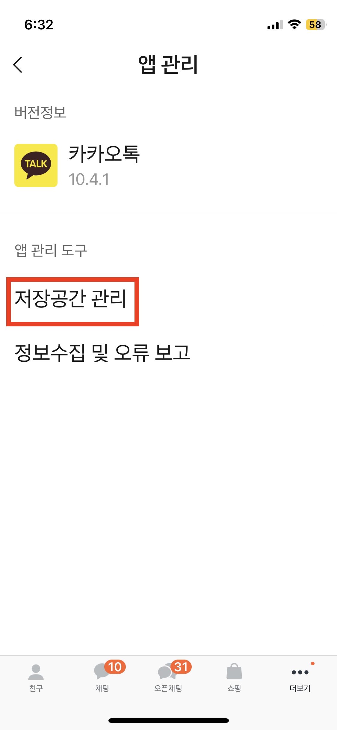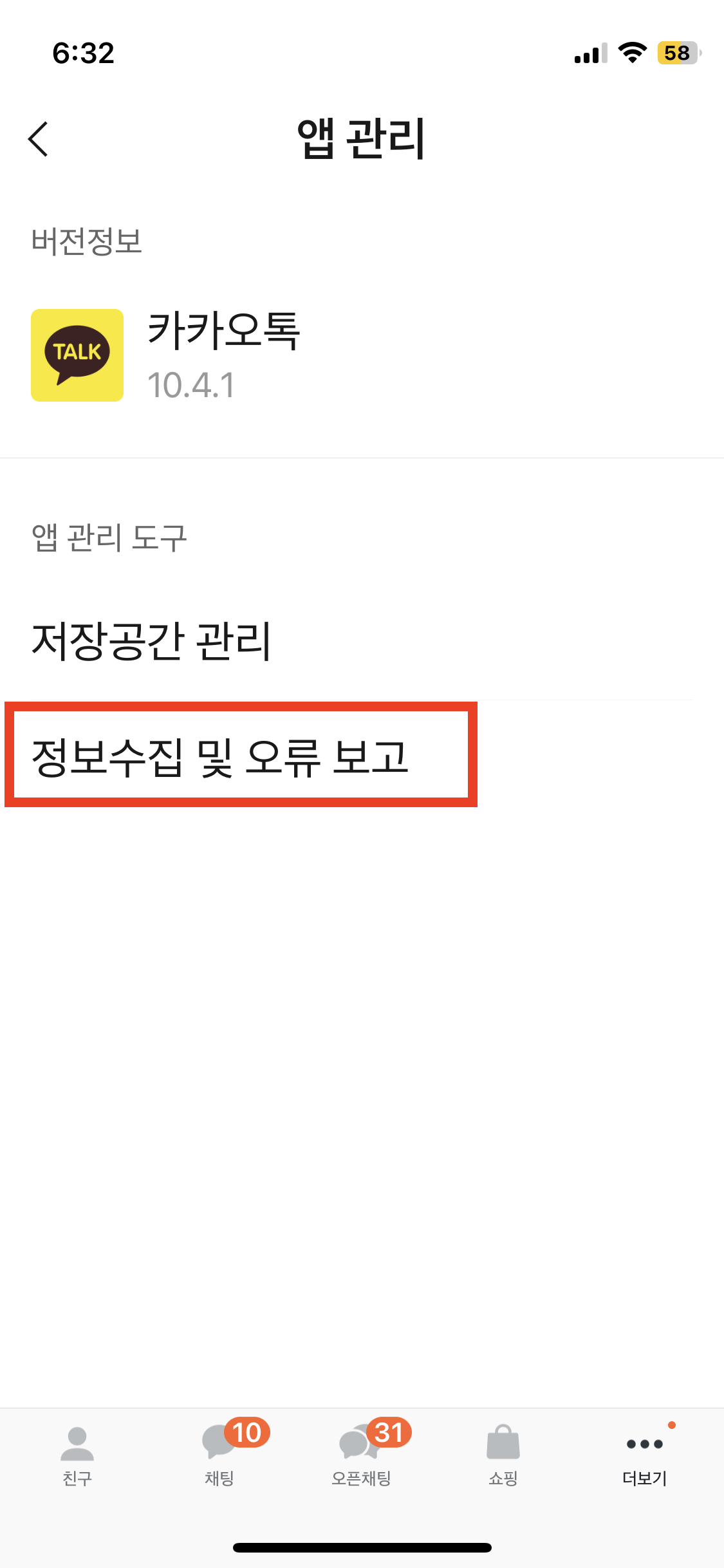 앱관리에서 정보수집 및 오류 보고를 들어갑니다. (이 선택지가 안보이신다면, 카톡을 업데이트 시켜주세요)