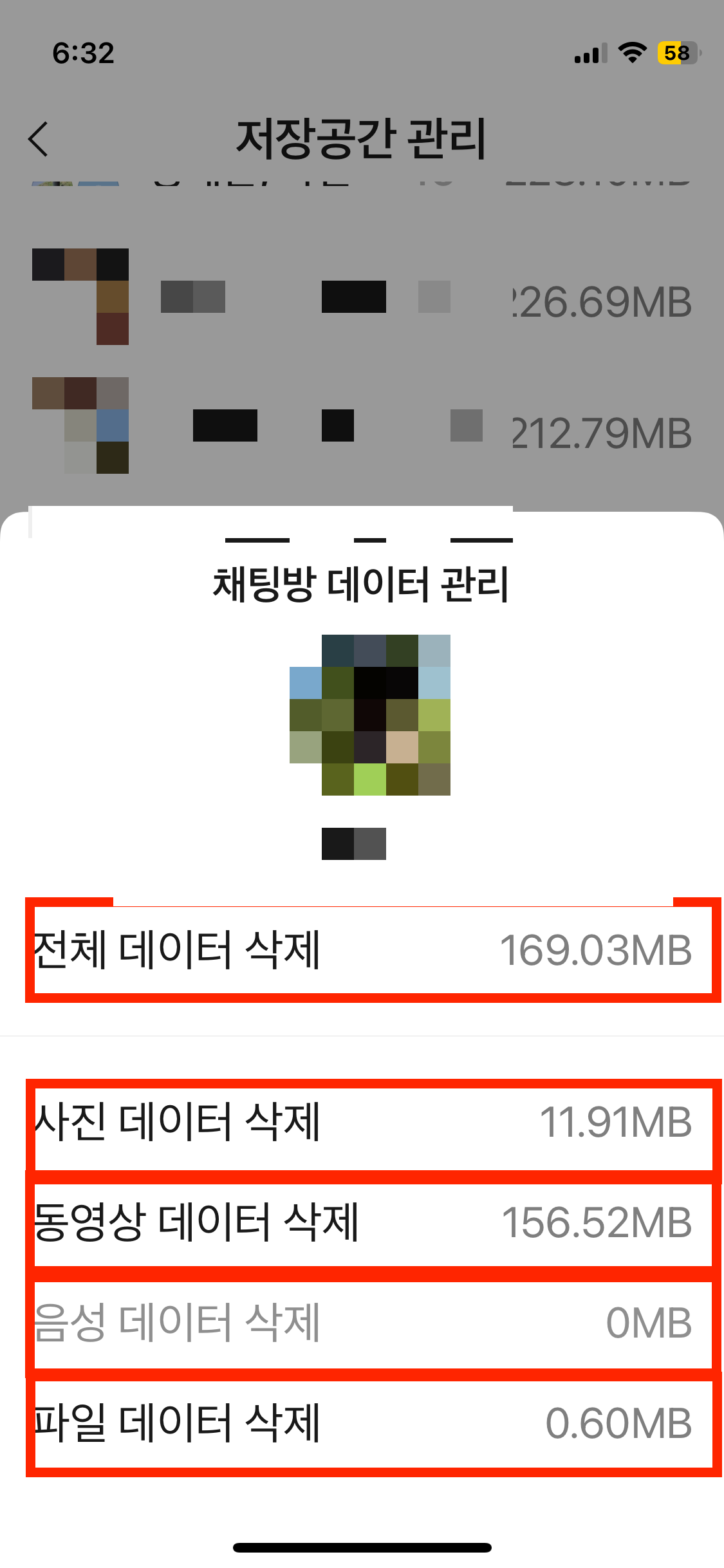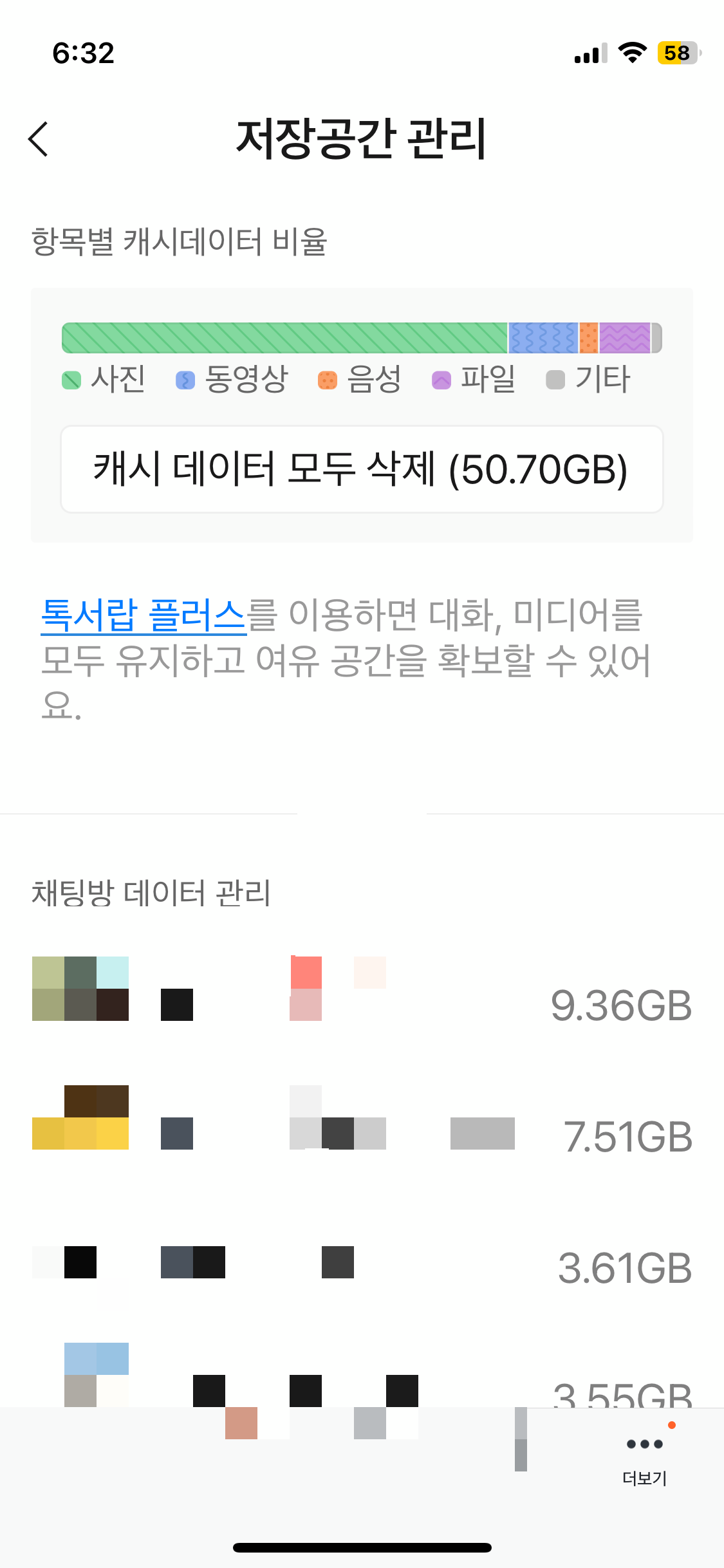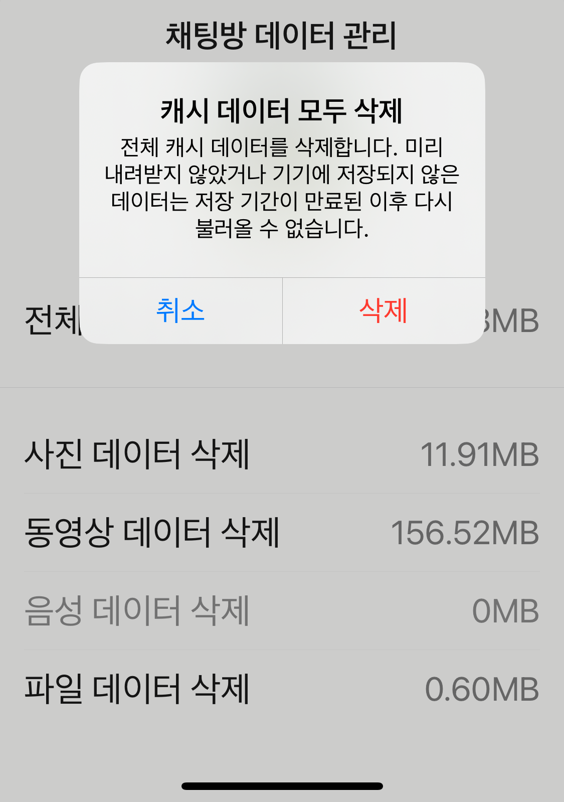 이 중 하나를 예시로 열어보면, 각 방의 캐시데이터를 분류별로 얼마큼 차지하는지 볼 수 있고, 원하는 종류만 삭제하거나 가장 위에 전체 데이터 삭제 버튼이 있습니다. 이를 누르면