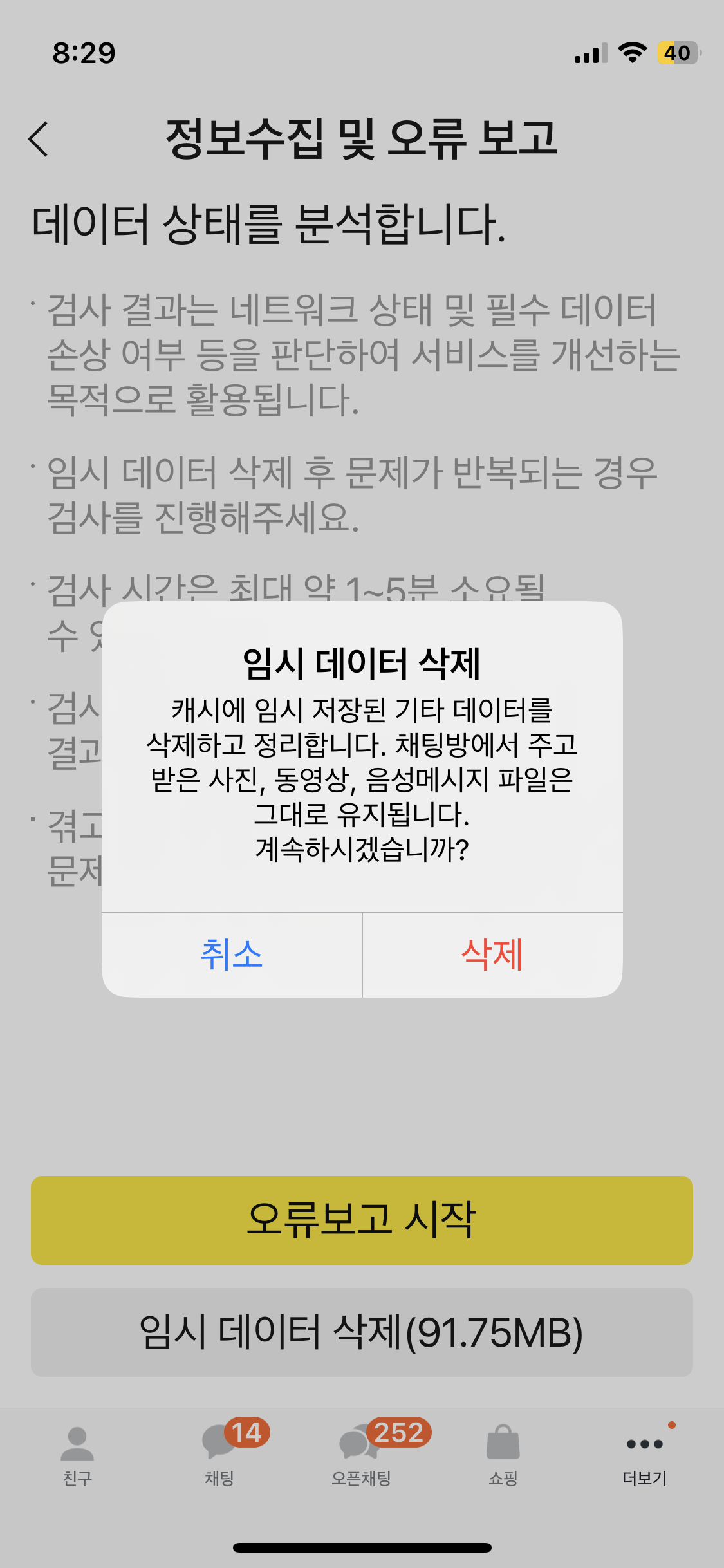 그럼 이와 같은 창이 뜨고 여기서 임시 데이터 삭제를 누르시면