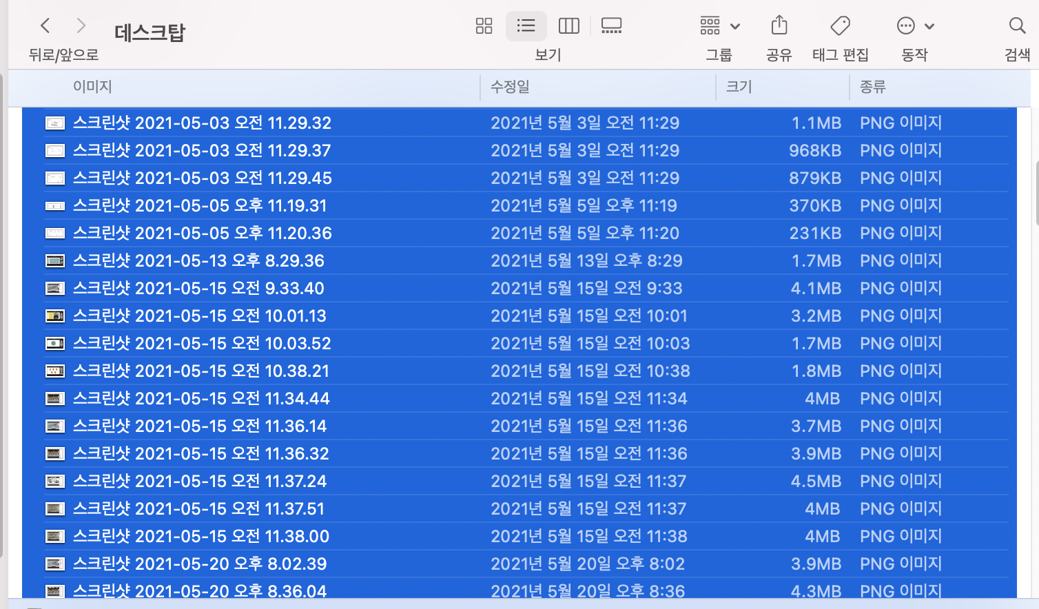 그래서 command +2 키를 눌러서 이와 같이 목록형으로 만들어야 쉬프트 키를 활용한 선택이 된다고 하니 참조 하자