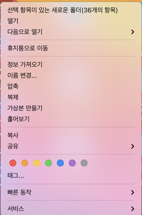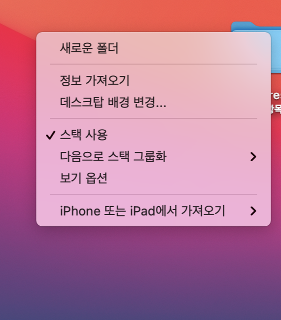 그러면 거기에서 다시 스택으로 따로 종류별로 하면 깔끔 하게 정리가 되는데, 이상태에서 여러분이 스크린샷을 전체 선택해서 오른쪽 클릭을 하면, 다음과 같이 선택 항복이 있는 새로운 폴더 라는 항목이 뜬다. 이걸 누르면 아주 쉽게 스크린샷들이 하나에 모이고, 당연하게도 데스크탑에도 스크린샷들이 다시 모여 있을 것이다.